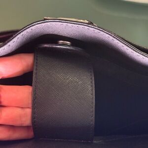Chic textured finish black satchel by Michael Kors. Features silver hardware and chain details. Fully lined with MK fabric. Five compartment pockets (1 zippered). MK silver lock and attached key inside leather fob. Handles and shoulder strap carry methods. Pre-owned but hardly used. Excellent condition (see photos for measurements) Perfect for stylish outings.from pet- and smoke-free home.