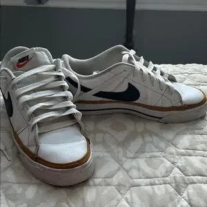 Classic Nike sneakers in white with black swoosh. Ideal for everyday style. Super cute and comfortable for all they use!