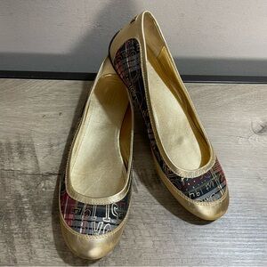 Women's COACH Metallic GOLD Leather TARTAN PLAID Graffiti DESIGNER BALLET FLATS