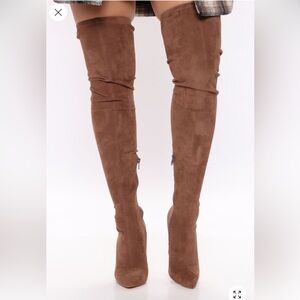 Chic heeled boots with a fold-over design. Perfect for adding elegance to any outfit. Suede including heel. Tall form fitting, goes above the knee about 2-3 inches can be worn as folded down. 4-1/2 inch heel. Brand new never worn