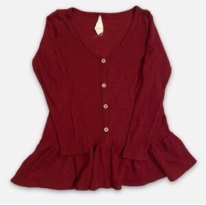 Super cute peplum sweater in a maroon color. It features a buttons on the front, V- neck, and long sleeves. Size small.