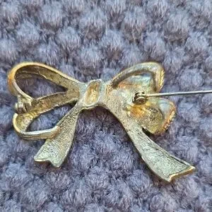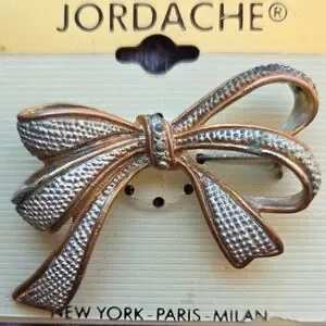 Chic Jordache brooch with metallic bow design. Ideal for a stylish accent.