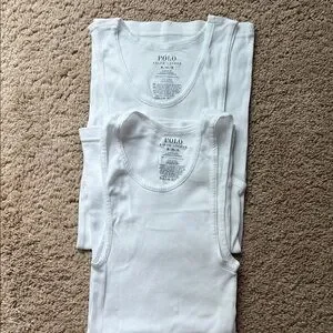 White ribbed tank tops by Polo Ralph Lauren. Features classic design and soft fabric.