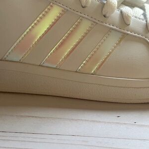adidas kids sneakers, adidas grand court youth, iridescent adidas shoes, girls white sneakers, boys white sneakers, size 3 youth sneakers, new adidas kids shoes