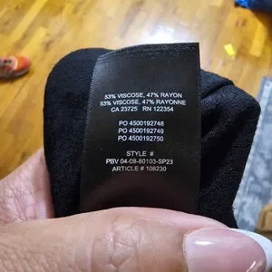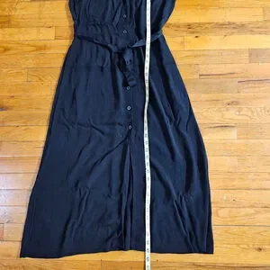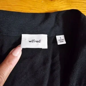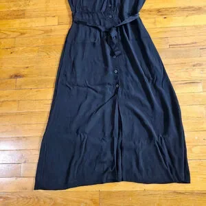 This is a pre-owned Wilfred black dress, size small. It features a collared neckline, short sleeves, and a button-down front with a matching fabric belt. The dress has a midi length with a front slit. Made from a blend of 53% viscose and 47% rayon.
