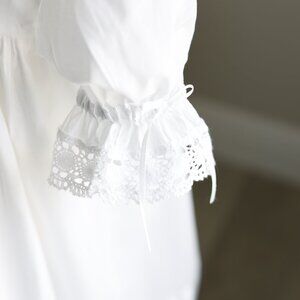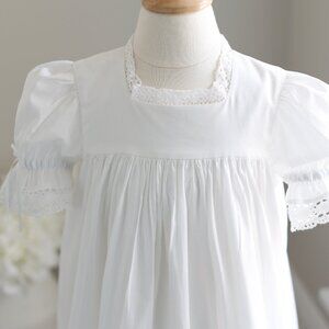 This Strasburg Heirloom Dress is Gorgeous!! Made of 100% cotton, this White Float style dress is hand made with luxurious details. The square neck is trimmed in a White crocheted cotton lace. The sleeves gather with a White satin ribbon trim with petite satin bows. The hem of the sleeves are trimmed in a matching crocheted cotton lace. The skirt of the dress is adorned with two 1" White satin ribbon bands with a French Tuck in between. The hem of the skirt is layered with two 1/2 inch White satin ribbon bands and two layers of matching Layered crocheted cotton lace. The dress is lined with a slip and has an upper button back closure. The buttons are covered in fabric (a high-end detail). This little dress is Angelic!! New Without Tags!!!!