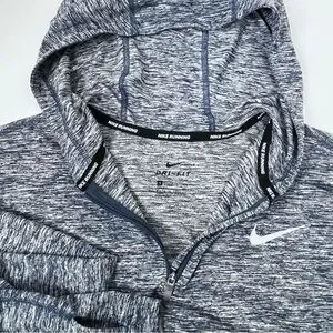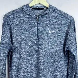 Nike Running Women's Dri-Fit Element 1/4 Zip Heathered Blue Hoodie Size S. Excellent Condition Women's Nike Running Hooded Lightweight Running Shirt; featuring thumb slots and reflective details.