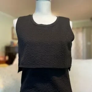 • Details: Layered bust overlay, scoop neck, sleeveless, clean hem