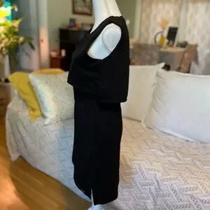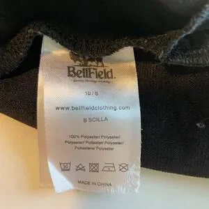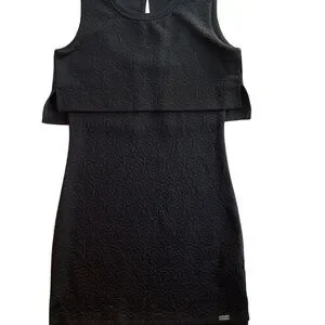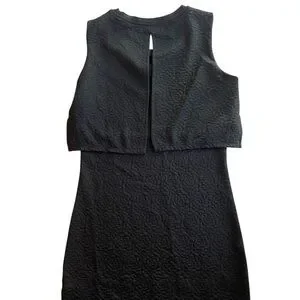 This is the Bellfield Scilla Jacquard Layered Dress in black. Crafted from 100% polyester with a subtle textured jacquard floral pattern, it features a scoop neckline and a stylish overlay at the bust creating a double‑layered effect — note: the dress is unlined. It’s machine washable. The tag reads UK 10 / S and fits much like a modern US small.