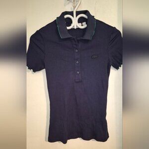 LACOSTE Navy Ribbed Polo Shirt with Green Flounced Trim SZ.32