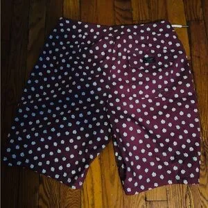 Burgundy board shorts with white floral design. Perfect for summer fun.