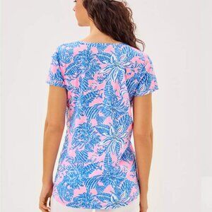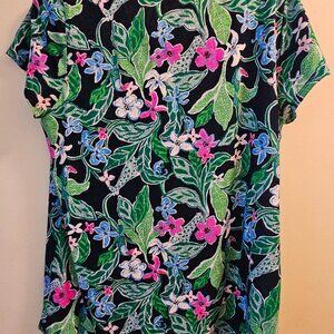 Elevate your summer T-shirt look with this comfy but beautiful Lilly Pulitzer top. Multi-color matches so many things! It has short sleeves but a long trunk length, which you can see in the last picture of a DIFFERENT print, just to get a good visual. Fits true to size but with shorter sleeve lengths.