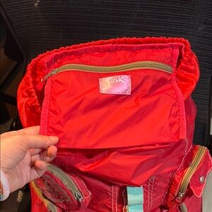 Vibrant backpack with bold PINK branding. Ideal for school or travel. Features multiple pockets for storage. Has all the iconic patches and university emblems. The PINK DOG GLOWS IN FLASHLIGHT it’s 3m which is so cool!!!