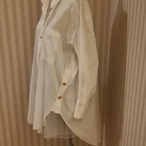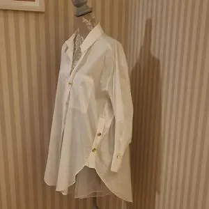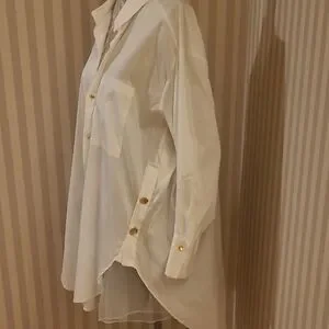 Sophisticated cream blouse with button-down design. Features long sleeves and a classic collar. Perfect for any occasion.