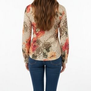 chicos women Stylish size 0 button down with bold floral design. Features red and orange flowers on a beige background. Ideal for casual or dressy occasions.used in excellent condition