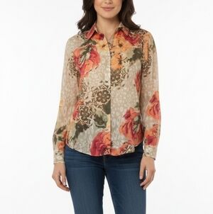 Chico's Women Shirt Size 0 Beige Floral Button Down Shirt