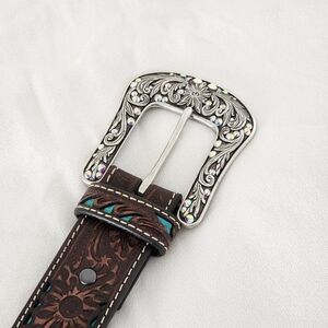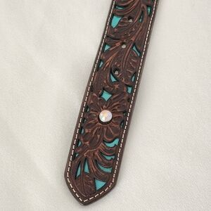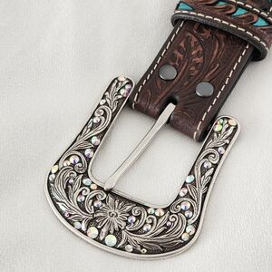 Crafted from rich **brown leather**, it features an intricate **floral tooled design** beautifully accented with vibrant **turquoise inlays**. The look is completed with a gorgeous **silver ornate buckle** that adds a classic, timeless touch.