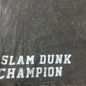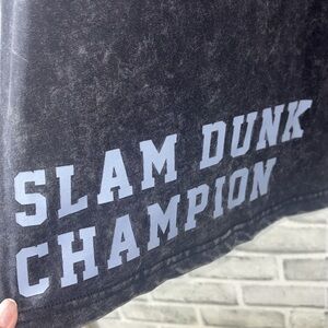 Washed black tee with basketball graphic. Casual and trendy. Ideal for everyday wear, for that special young man in your life. 100% cotton, great all around. In a washed black mineral wash, “Slam Dunk Champion.”