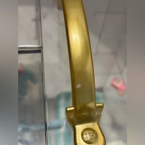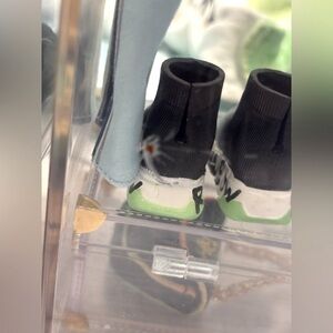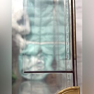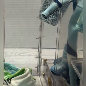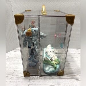 Rainbow High fashion closet with stylish accessories. Features a clear case with gold accents. Includes colorful clothing and shoes.