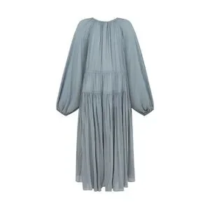 Effortless long sleeve dress in a soft dusty blue. Features an adjustable elasticated neckline along with two adjustable side ties at the waist so that you can completely customize the silhouette. Versatile and easy.