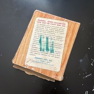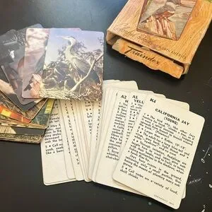 Vintage Traindex cards featuring colorful birds of North America. Includes a vibrant bird illustration and info about its habitat, song, and appearance on each card. This pack retains 45 or the original 47 cards. The box is structurally okay but is in poor condition.