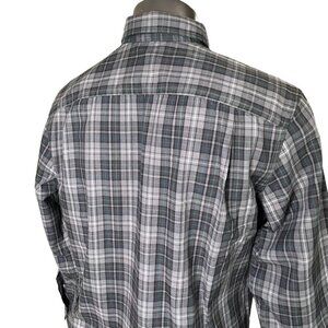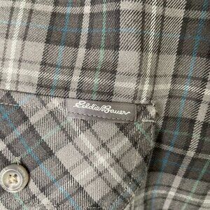 This Eddie Bauer men's button-down shirt in size L is perfect for any casual occasion. Made with a comfortable plaid pattern and featuring double pockets for added style and convenience.