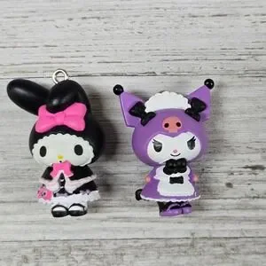 Adorable Sanrio My Melody and Kuromi charm set, perfect for adding a touch of kawaii goth flair to your accessories. These charming pendants feature My Melody in a black and white lolita-inspired dress with a pink bow, and Kuromi in a purple maid outfit with a skull accent. Ideal for attaching to your keys, backpack, or purse, these charms bring a playful and unique aesthetic to any item.