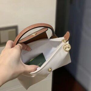 Elegant Longchamp cosmetic bag in rich burgundy and tan. Compact and stylish for daily use.