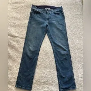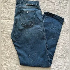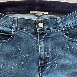 Stylish blue jeans with star embroidery. Features a button closure. Perfect for an elevated take on casual!
