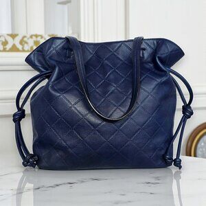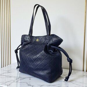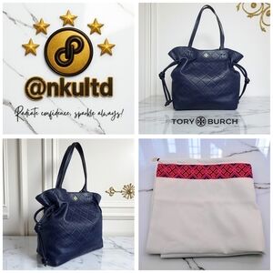 Say hello to your new go-to luxury tote! ๐ This authentic Tory Burch Georgia tote is crafted in rich navy blue quilted leather with a soft slouchy silhouette and luxe gold-tone hardware. Itโs effortlessly chic with double handles, side drawstring detail, and a spacious open-top interior with a secure snap closure. Inside, youโll find a clean navy canvas lining, one zippered pocket, and one slip pocketโperfect for keeping your essentials organized. Comes with the original Tory Burch dust bag. Itโs in excellent pre-owned condition with barely noticeable wear at the corners (zoom into the pics!). The interior is absolutely pristine and ready for your everyday glam! โจ