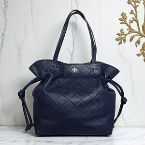 Tory Burch Georgia Quilted Leather Tote Navy Blue Slouchy Golden Hardware