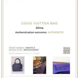 This exquisite Louis Vuitton Alma BB bag is crafted from ostrich leather in a rich, vibrant shade of purple, showcasing the distinctive quill follicle pattern characteristic of authentic ostrich skin. The bag maintains the structured Alma dome shape and dual top zippers. It features rolled ostrich leather top handles and is accented with polished gold-tone hardware, including a padlock and two keys (#312). An additional strap is included, so the bag offers top handle, shoulder, or crossbody carry. This bag combines opulent LV Alma design with the luxurious appeal of exotic leather in a rare color. The exterior is in excellent used condition with lock, keys, and 2 dust bags (one for the bag and one for the lock and keys). The interior is the same color as the exterior with visible "ostrich" marks on the bottom of the bag.