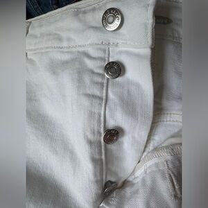 Stylish white mini skirt. Perfect for casual outings. Simple and elegant design. 21 inches across the front of the waistband with stretch. White denim skirt button butterfly closure front and back pockets RAW hem