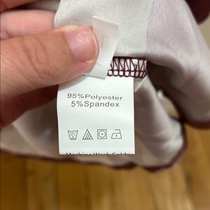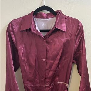 Elegant maxi dress with burgundy and beige stripes. Features a collared neckline and long sleeves.