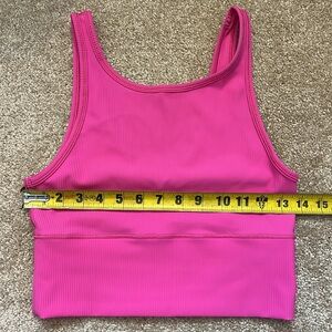 Bright pink ribbed crop top with a sleeveless design. Perfect for casual outings.