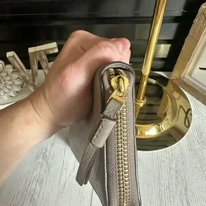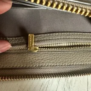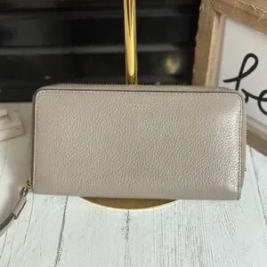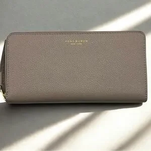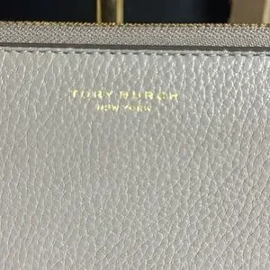 Chic Tory Burch accessory in taupe leather. Ideal for stylish outings.