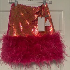 Turn heads with this stunning Nadine Merabi mini skirt in size XS (new with tags). This glamorous piece features vibrant orange and pink sequins with a dramatic hot pink feather hemline—perfect for a night out, special event, or party.