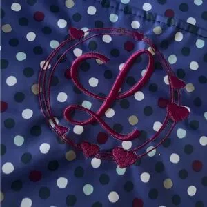 Features an embroidered letter "L" and hearts