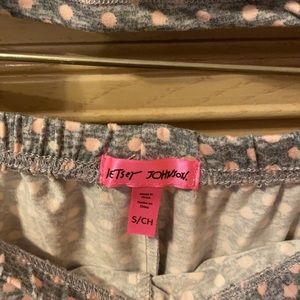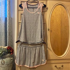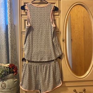 Betsey Johnson Sleep Set. Shorts and tank top sleep relax set. Polka dot, lace heart, pink heart, Valentine’s Day. Super soft! Gray and light pink. Size small. Great for spring and summer, warmer months. Pajamas, sleepwear.