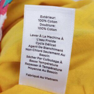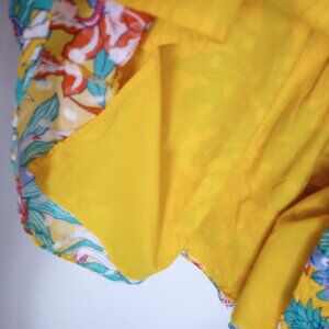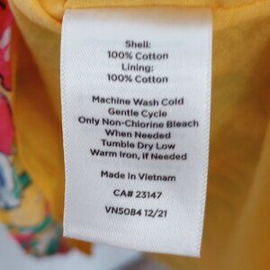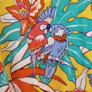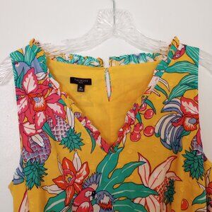 Talbots Tropical Birds of Paradise Floral Midi Dress, colorful flowers and parrots on yellow background, sleeveless, belted at the waist, side pockets, lined. Pretty tropical island Hawaiian print, great for summer vacation, travel, beach weekends.