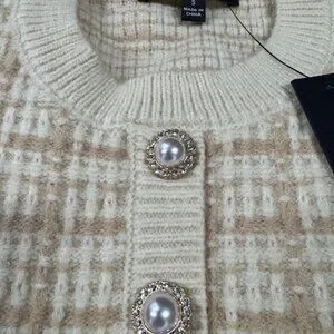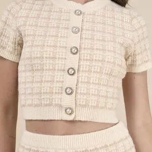 Soft, textured sweater knit features a subtle plaid design as it shapes this two-piece dress with a crew neckline and short sleeves. Bodice has a functional button placket at front, with faux pearl buttons that boast sparkling rhinestone accents. Matching skirt has a high, elasticized waist and a bodycon silhouette, ending at a mini hem. Ribbed knit trims the neckline, cuffs and hem of the top, as well as the waist and hem of the skirt.