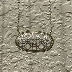 Chic necklace with a geometric pendant. Features gold and silver tones. Perfect for any occasion.