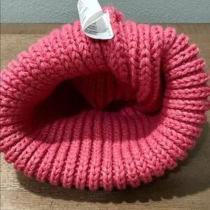 Pink beanie with playful pom-pom. Soft knit for warmth. Stylish and fun!