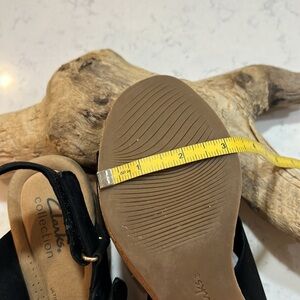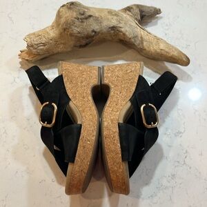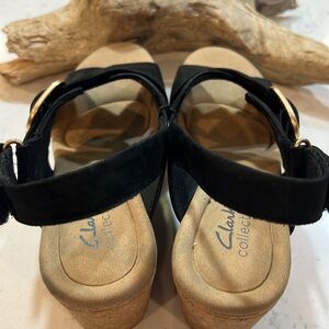 Clarks Giselle Dove Black Nubuck Size 8 in great pre loved condition. First photo is stock. Channelling the dressy, feminine look of high heels without compromising on comfort, our Giselle Dove sandal sits atop a cork-effect wedge that moves you forward effortlessly, all-summer long. We know you can only make the most of the sunshine with happy feet, so we've crafted this nubuck silhouette with a soft, pillowy Ultimate Comfort footbed - that means less time worrying about sore soles, and more time enjoying those blue skies.