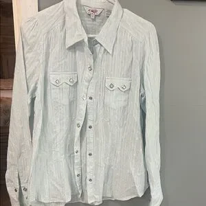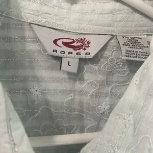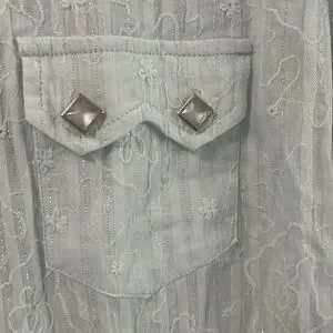 Elegant white button down shirt. Features diamond-shaped accents on pockets. Long sleeves with a classic collar.