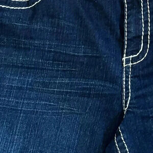 Measurements: Waistband 42”/107.5cm Hips 46”/117.5cm Rise 28.5”/72.5cm front to back Dark wash denim colour Cotton/Spandex fabric