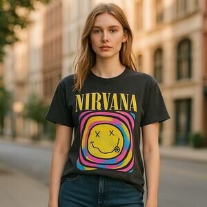 nirvana, band, smiley, graphic, tee, tshirt, colorful, psychedelic, concert, ladies, medium, groovy, mod, go go