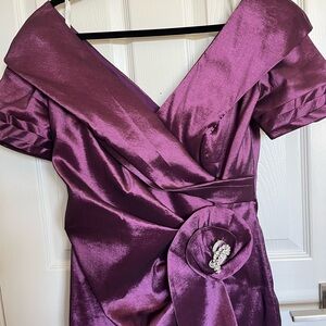 Keywords: MOB, Formalwear, Weddings, Parties, Special Occasions, Fully Lined, Wrap Look, Like New, Zip Up, Flattering, Purple, Knee Length, Holiday, Grooms Mothers Dress
