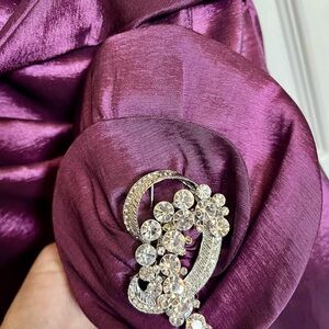 The JADE COUTURE Mother of the Bride or Groom dress in size 14 is a stunning knee-length fully lined formal piece perfect for weddings or parties. This elegant dress features a solid purple color with a chiffon fabric and off-the-shoulder short sleeve design, making it both stylish and lightweight. The boat neck and ruched accents add a touch of sophistication, while the zip closure ensures a secure fit. There is an added Rhinestone Brooch that elevates the elegance of this dress. There are two tiny rhinestones that are missing but it is hard to tell when looking at the dress. This dress is designed by Jade Couture, a reputable brand known for creating high-quality and classic wedding attire.