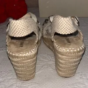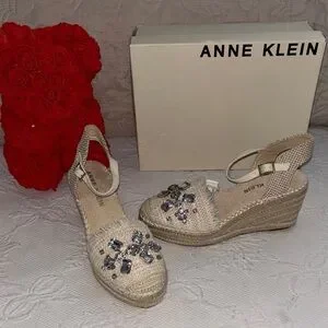 Chic espadrille wedges by Anne Klein. Cream color with sparkling gem details. Ideal for adding elegance to any outfit.